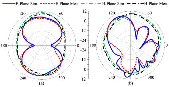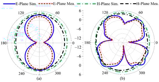 The suggested UWB antenna’s radiation pattern at resonance frequencies of 8 GHz and 13 GHz is illustrated in Figure 12 without the application of an FSS layer. The proposed UWB antenna delivers a bidirectional radiation pattern for the E-plane at 8 GHz, but an omnidirectional radiation pattern on the H-plane at both operational frequencies. At 13 GHz, the radiation pattern is butterfly-shaped, which may be due to multiple stub insertions. The simulated results of the proposed antenna show strong agreement with the measured radiation pattern. On the other side, Figure 13 illustrates the radiation pattern of the suggested UWB antenna loaded with single-layer FSS. The radiation pattern was simulated and measured at resonance frequencies of 8 GHz and 13 GHz. The FSS at the rear side of the antenna reflects the backward radiation, due to which the broadside radiation pattern is obtained.