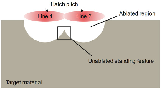 The time between the scanning of parallel lines is considerably longer than the time between the consecutive pulses in one line. Therefore, the material can be considered to have cooled down to the room temperature before the ablation of the next line and the incubation can be reset before the simulation of each line. However, the larger hatch pitch means that an unablated standing feature can be present between the parallel lines during ablation. An illustration of this phenomenon is shown in Figure 1.
