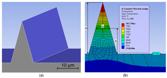 For these simulations, a cube of material with a 100 µm side is used to represent the bulk material. The standing feature, representing the “Unablated standing feature” inside the ablated crater from Figure 1, is positioned on the top surface of this cube and the heat flux is applied on all upward-facing surfaces, as shown in Figure 2a. The mesh size is set to adaptive with a maximum size of 0.5 µm on the faces of the standing feature, and the time increment step is set to “program controlled” with the initial, minimum, and maximum time steps of 20 ps, 2 ps, and 200 ps, respectively. The temperature profile inside a feature with a 15 µm height and a 30° angle is shown in Figure 2b.