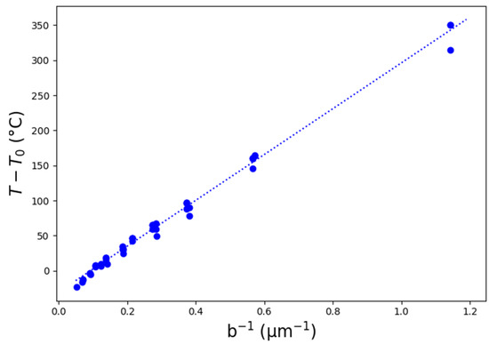 In Figure 2b, we see that the temperature increases with increasing height in the standing feature. Additionally, we see that the surface without a standing feature is only slightly heated up by the pulse ( ≈ 52 °C), which is to be expected. Figure 3 shows the difference between the temperature in the feature and the temperature on the top surface without standing features in the function of the inverse of the local feature width b. Each data point corresponds to a combination of feature height, feature angle, and measurement height (see Table 1).