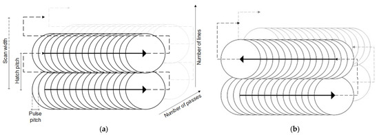 Schematic of the scanning parameters for (a) unidirectional and (b) bidirectional strategy. The continuous bold arrows represent the laser path in the pulsed mode. The dotted arrows represent the laser path without ablation.