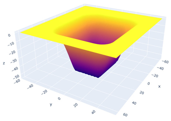 The first fitting is carried out only for (i.e., with the inclusion of Equation (16)), meaning that R is kept independent of the feature geometry. Because the threshold fluence should always be positive, should always be smaller than . With a resolution of 0.8 µm and , the upper boundary condition is . The cross-sections of the simulated grooves for and are shown in Figure 10a–c, respectively.
