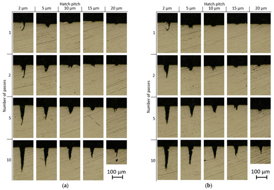 Cross-sectional 7 mm profiles from the start of the grooves of (a) unidirectional and (b) bidirectional grooves, as a function of hatch pitch and the number of passes.