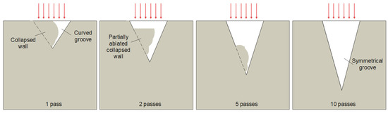 Another notable phenomenon is the curvature in the grooves with a hatch pitch of 2 µm and a low number of passes (see Figure 6a,b, for 1 pass). A similar phenomenon has also been observed and studied by Zhao et al. [16] with picosecond pulses in the titanium alloy. The bending at a high aspect ratio was attributed to the laser polarization, the laser interaction with the ejected material or plasma inside and above the crater, and the morphology on the crater surface. Contradictory to [16], in this case, the aspect ratio of the grooves is much lower and the curvature is not present anymore at higher numbers of passes. Hence, the reason for the groove curvature seems to be the re-solidification of the molten groove wall during the first pass. In other the words, the groove wall collapsed due to extreme power density at 2 µm hatch pitch in the first pass. A similar phenomenon has been documented by Zhidkov et al. [5] for the high-fluence regime, leading to melting within the heat-affected zone. The suggested sequence of events is explained schematically in Figure 7. During the first pass with a hatch pitch of 2 µm, the irradiated material surface is mostly flat, leading to high absorbed laser energy. This high energy absorption, combined with the small hatch pitch and a high number of lines, causes ablation as well as melting. This results in the wall collapsing, which gives rise to a narrow and irregular groove. The asymmetrical shape of the crater with collapsed wall can be attributed to the sequence of lines during laser scanning (up–down or down–up in Figure 4), which causes non-uniform heat distribution inside the material and asymmetrical melting. From the second pass-on, the total energy density decreases due to the reflection caused by the inclined walls. The combination of higher reflectivity and distribution of the laser fluence over a larger surface area reduces the absorbed energy density and leads to cold ablation, where the unablated material remains in a solid state. As a result, the second pass deepens the cavity and partially ablates the collapsed wall. At 10 passes, the collapsed wall is fully removed and the groove is symmetrical.