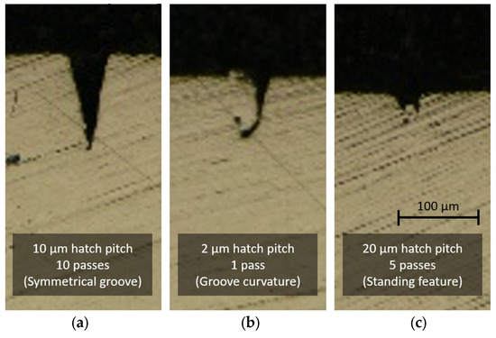 At large hatch pitches (15 and 20 µm), the grooves are less well-defined and traces of remaining material can be seen on several cross-sections. Figure 8 highlights the differences in groove profiles.