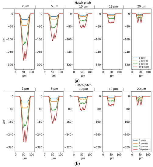 Analogous to Figure 6, the cross-sectional profiles of the simulated grooves without geometry-dependent threshold fluence and reflectivity (i.e., with Equations (7) and (8)) are shown in Figure 9a,b.