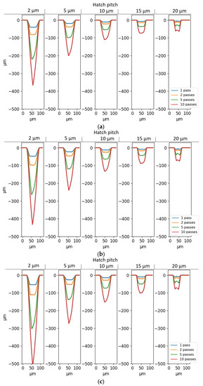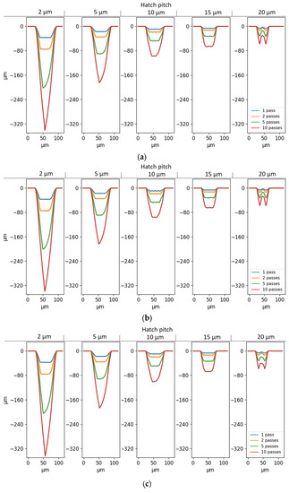 Simulated cross-sections of unidirectional grooves with geometry-dependent threshold fluence, as a function of hatch pitch and number of passes. (a) = 0.01; (b) = 0.02; (c) = 0.043.