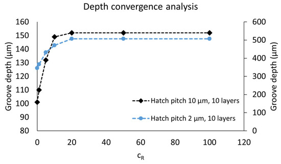 Depth convergence analysis for grooves obtained with 10 layers with hatch pitches of 2 µm (primary vertical axis) and 10 µm (secondary vertical axis).