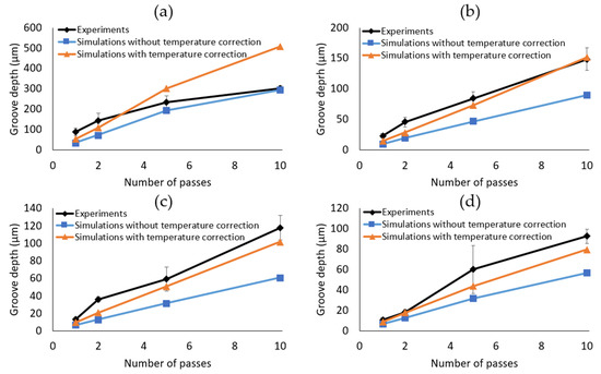 Depth comparison of the experimental and simulated grooves, with (, ) and without geometry-dependent material parameters for different hatch pitches: (a) 2 µm, (b) 10 µm, (c) 15 µm, and (d) 20 µm in function of the number of passes. The error bars represent the standard deviations.