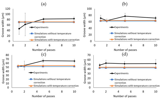 Width comparison of the experimental grooves and the simulated ones, with (, ) and without geometry-dependent material parameters for different hatch pitches: (a) 2 µm, (b) 10 µm, (c) 15 µm, and (d) 20 µm in function of the number of passes. The error bars represent the standard deviations.