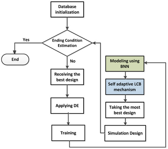 where means the vector in current denotes the best user solution in current and are randomly selected mutual solutions from the population. The parameter represents the mutual vector and is used for scaling factor. Figure 1 explores the flow chart of the presented algorithm, which shows the basic role of the BNN and LCB mechanisms.
