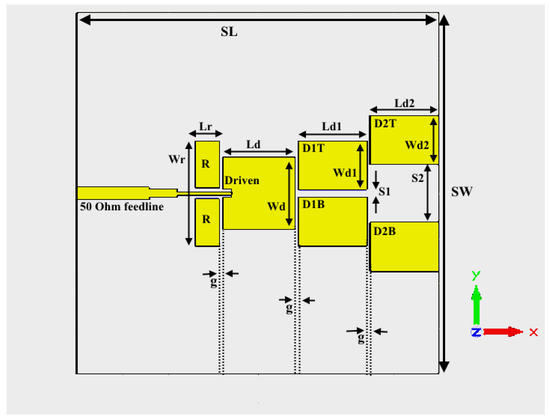 D (Driven element), D1T (Top Director 1), D1B (Bottom Director 1), D2T (Top Director 2), and D2B make up the remaining elements (Bottom Director 2). To simulate the antenna design, a double copper-clad board made of RT/Duroid 5880 material (epsilon = 2.2) was used. The Reflector Element R with Wr and Lr; the Driven Element D with Ld and Wd; the Director 1 element D1T and D1B with Ld1 and Wd1 indicating the value of length as well as width; and the Director 2 element D1T and D2B with Ld2 and Wd2, indicating the length and width, respectively. The length of g separates every element along the x-axis. S1 divides the Top Directors 1 and Bottom Directors 1, while S2 displays the separation between the Top Directors 2 and Bottom Directors 2. SL and SW stand for length and width of the substrate, respectively. The substrate has a thickness of 0.1 mm. The substrate’s overall dimensions are 10.01 × 10.8 mm2. The CST MWS design tool simulates the design. The suggested design’s parametric values are shown in mm in Table 1.