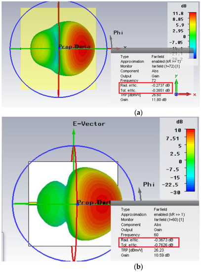 Figure 9 illustrates the 3D far-field pattern for 72 GHz, which has a high gain of 11.8 dB and a directivity of 12.1 dBi.