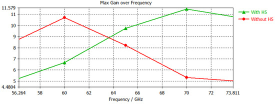 Figure 5 compares the outcomes of the proposed model based on it with and without heterogeneous substrate. The horizontal axis is associated with the frequency range, while the vertical axis is maximum gain on the specific frequency. The without heterogeneous substrate model has a max. gain of 10.2 and varies sharply with an increase or decrease in frequency, while the design with heterogeneous substrate has a max. gain of 11.8 and is quite stable as compared with the design without heterogeneous substrate.