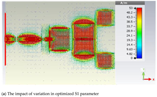 Due to their shorter length than the driven element, the D1 elements (D1T and D1B) are actually in charge of obtaining beam directionality and producing an additional band at a higher frequency. S1 and S2, which represent the gaps between Top Directors and Bottom Directors and are located along the y-axis, are typically in charge of improving. To obtain the strong coupling between the Driven and Director 1 elements, the S1 parameter needs to be small. The distance between the director and driven components must be kept as short as feasible in order to put the parasitic elements next to the driven elements. The gap capacitance will decrease as the electric field coupling increases. The top surface current distribution shown in Figure 4 will make the impact of changing the S1 parameter clearer. The S1 in Figure 6a is in accordance with the plan, showing the excellent surface current distribution caused by good coupling between Director 1 and Driven elements. The S1 parameter is substantially larger than the initial value in Figure 6b, which leads to poor coupling between Driven and Director elements and a reduced surface current distribution.
