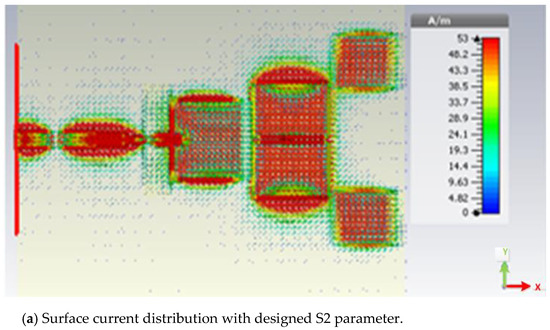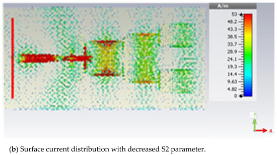 The effects of changing the S2 parameter up or down are clearly seen in the surface current distribution shown in Figure 7a,b. As previously stated, the gain improvement is caused by the S2 parameter, which widens the antenna’s effective aperture. Director 1 has an effective width that is nearly twice as wide as its physical breadth. To obtain the smallest radiations required for resonance, the center of Director 2 may therefore be placed next to the center of Director 1. Therefore, it was found that raising S2 causes gains to continuously improve, and vice versa. Due to insufficient coupling capacitance, an excessive increase in the S2 parameter will cause yields to drop.