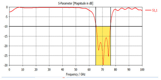 Figure 10 demonstrates the 2D far-field radiation behavior of gain at frequencies of 65, 66, 68, 70, 72, and 74 GHz, respectively. The angular width (3 dB) and main lobe magnitude and direction can be noticed in Figure 9. At 72 GHz, the angular width (3 dB) is 36.8°, and the main lobe direction is at 28°, whereas the maximum magnitude of the main lobe is 11.8 dB.