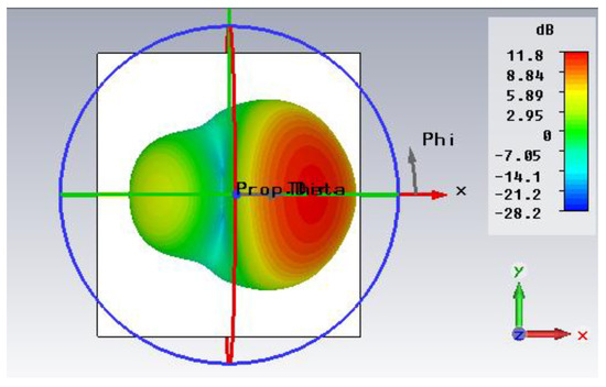 As shown in Figure 6a, the radiation is at its greatest because D2 elements are connected from the margins of the D1 component. This causes the effective aperture to have a wider electrical field, which increases gain. The antenna’s electrical width is narrower in Figure 6b than in Figure 5a, which causes a weak surface current distribution and lower gain. The design’s simulation results show an impedance bandwidth of 15.17% in a range of 10.72 GHz. In Figure 8, the S11 parameter is displayed.
