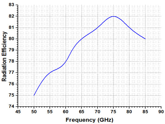 The millimeter-wave spectrum, which is anticipated to be used in the next generation of 5G technology, is where the band of the intended antenna is located. With regard to applications such as device-to-device communication, WLAN, and WPAN, the V-Band (50–75 GHz) of millimeter waves should be used (D-2-D). The optimum range of the presented model is evaluated in Table 3, whereas Table 4 compares the proposed approach with state-of-the-art techniques, which explains that the outcomes of the presented model are more efficient than current models. The estimation among radiation efficiency and frequency is mentioned in Figure 11. This shows that the presented model efficiency is recorded at more than 85% at frequency ranges from 70 to 76 GHz. Additional investigations of the proposed model are performed in terms of gain and frequency, which are declared in Figure 12. It can be seen that the presented model exhibits fruitful gain at a frequency of 75 GHz.
