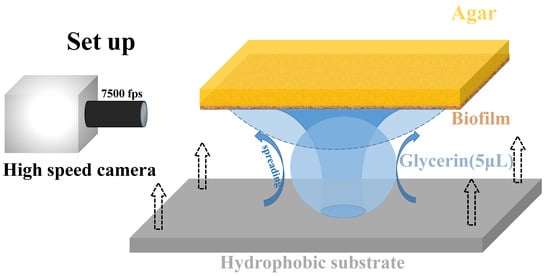 Experimental setup of glycerol droplet spreading on biofilm. A glycerol droplet with a volume of ∼5 L (radius 1 mm) was initially introduced onto a superhydrophobic glass slide below. The upside down biofilm, with different growing times, gently approached the sessile droplet on the substrate beneath. A fast camera aside was used to record the whole spreading process and the detachment of the droplet from the lower substrate, at a frame rate of 7500 fps.