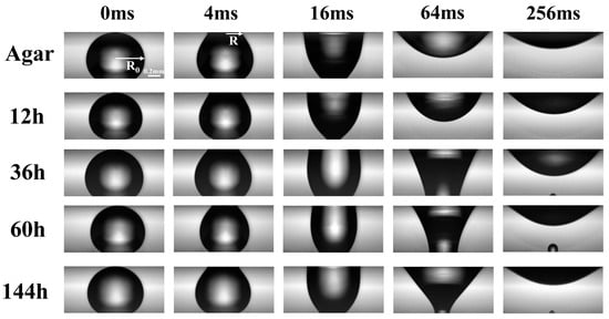 Since the surface energy of the upper surface (biofilm, hydrophilic), was higher than that of the one below (superhydrophobic glass), thus the droplet was easily transferred onto the biofilm from the glass slide below and immediately expanded onto the biofilm. Figure 2 shows the sequential snapshots over time of the spreading processes on the different biofilms growing with time duration of (in hours) from the beginning of culturing on agar plates. Here, the time zero was set as the moment of the droplet immediately touching the biofilm at its apex. Vertically, in Figure 2, droplet shapes on different biofilms picked up at different growing times , are compared at the same moment of spreading time. The contact area of glycerol with the hydrophobic substrate gradually decreased during the spreading of glycerol droplet on the bacterial film, as shown in the snapshot at ms (Figure 2). All of the droplets were able to spread onto the biofilms driven by surface tension and, finally, stuck onto the biofilms with a pinned contact line after ms.