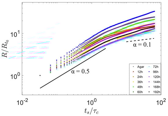 The contact radius between the droplet and the biofilm increased over time, which was normalized as and plotted in Figure 3. The spreading process can be quantitatively expressed as a scaling relation of with power exponent , where is the initial radius of each droplet.