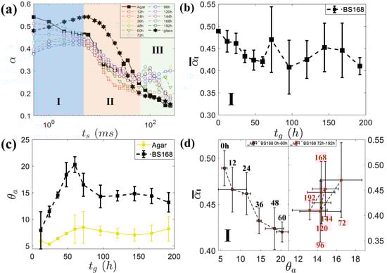 It is interesting to correlate the spreading exponent at the stage I average on repeated measurements to the growth time of different biofilm phases, as shown in Figure 4b. It can be seen that decreases monotonically with growth time within the duration of 0h, while the data from 60 h has no obvious trend but possesses a large standard deviation.