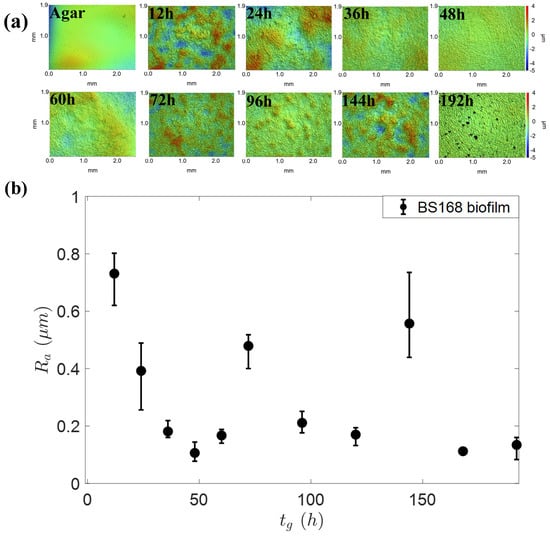 Then, the questions also arises as to how and why the contact angle changes with the growth time of the biofilm? The wetting properties of a surface can be tuned by the surface features (physical heterogeneity), and chemical inhomogeneity. The influences of these surface properties on wettability are mostly coupled together, making the analysis very complicated [29,30]. Therefore, a common method is to find the main parameters from various influencing parameters according to data fitting. It was reported that the topography of the biofilm surface (bacteria Bacillus subtilis) changed its wettability in different growth phases [12,31]. Here, the roughness of the biofilm surface during continuous growth is characterized by using a white-light interferometric profilometer. Figure 5a shows the topography of the biofilm at different growth times. It can be seen that the biofilm surface becames smoother before 60 h, and then gradually reaches saturation. The average surface roughness depended on the growth time, as shown in Figure 5b. Additionally, the agar was very smooth, and its was just 0.057 ± 0.03 m.