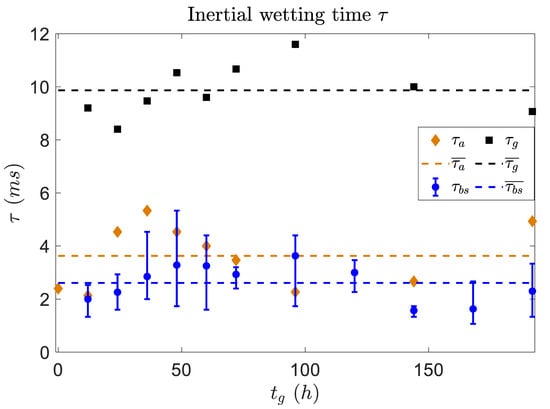Characteristic time scales of inertial spreading. Values of are extracted from Figure 4, correspondingly for droplets spreading on biofilm (blue markers), bare agar gel (orange markers), and a normal glass slide (black squares) as control experiment.