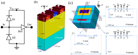 As shown in Figure 1a, the study is based on typical ESD protection circuits in digital circuits. The circuit model consists of two diode TCAD models and one inverter TCAD model port cascade. In Figure 1b, the diode TCAD model is the physical equivalent numerical model of the three-dimensional shallow trench isolation (STI) diode. In the diode model, the anode is connected to the P-type heavy doping region and the cathode to the N-type heavy doping region. Moreover, the length of the electrodes is 0.35 μm. The double cathode diode structure is used because increasing the cathode width can reduce the conduction resistance and the over-surge voltage to improve DC performance and fast transient performance [19]. In addition, the three-dimensional diode model is extended along the Z-axis using the two-dimensional diode model, which optimizes the simulation speed while guaranteeing the simulation results [20]. In Figure 1c, the INV TCAD model is a three-dimensional physical equivalent numerical model of multi-gate CMOS. Moreover, C1 and C2 are the cross sections of PMOS and NMOS tubes in the INV model, showing that the model is a dual-gate, dual-source, single-drain CMOS and showing the electrode connections as inverters. C3 is a cross-section of the INV model’s source–drain channel, showing the dimensions of the active region and NWell, which are adjusted to make the model universally applicable. The gate oxide thickness of the CMOS is 0.015 μm, and the gate length is 0.35 μm. In the circuit, the gates of CMOS, the anode of D1, and the cathode of D2 are connected to the node “In”, and the drains of CMOS are connected to the node “Out”. The sources of positive channel Metal Oxide Semiconductor (PMOS) and the cathode of D1 are connected to the power supply VSS = 5 V. The sources of Negative channel-Metal-Oxide-Semiconductor (NMOS) and the anode of D2 are connected to the ground. The initial temperature of all devices in the circuit is set to 300 K. Moreover, The thermal electrode is specified at the bottom of the devices, where the lattice temperature maintains at 300 K.