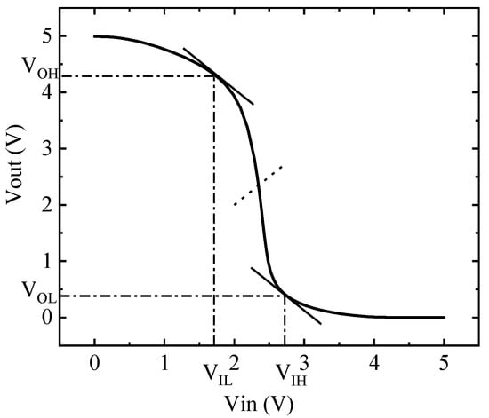 The static input and output characteristics of the CMOS inverter circuit are shown in Figure 3, where VOH = 2.956 V, VM = 1.502 V, VOL = 0.288 V, VIL = 1.690 V, VIH = 2.766 V.