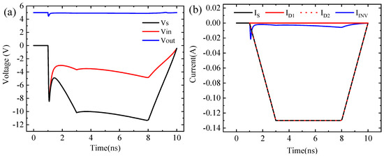 Based on previous studies and the actual TLP pulse signal, the negative TLP simulated input signal is a rectangular wave current signal [23,24]. In Figure 4, the TLP pulse generator is partially equivalent to a current source Is and a resistance Rs. Moreover, D1, D2, and INV constitute the ESD protection circuit model. The response of the circuit model to TLP injection can be studied by observing the voltage and current of the nodes In and Out. Figure 5 shows the transient signals of nodes In and Out when negative polar TLP pulses are injected. In Figure 5a, the TLP negative polar current signal has a rising edge of 1ns, a pulse width of 5 ns, an amplitude of 0.13 A, and a decreasing edge of 1 ns. As shown in Figure 5b, the pulse signal begins to inject at time = 0.5 ns, and VIn = 0 V. So the ESD protection circuit is not started when the input resistance RIn at node In is much greater than RS = 50 Ω, which makes the VIn rise rapidly and approximately equal to VS. The ESD protection circuit then starts, and the current is discharged from the D2 to the ground. Meanwhile, the input resistance RIn decreases rapidly, approaching RS. As shown in Figure 5a, the ID2 is approximately equal to the IS during TLP, so the D2 plays a protective role during negative polarity injection so that the gate of the CMOS inverter does not break down. However, a large amount of current passes through D2, which also results in a large amount of Joule heat inside the D2 tube, causing its temperature to produce a high-temperature area, which may cause burnout damage. Moreover, due to the existence of the gate capacitance, the IINV changes with the INV input voltage VIn, which makes the output VOut of the CMOS inverter change in the same direction as the VIn. If the peak burr of the output signal changes greatly, it may cause the output to flip. To meet the design requirements for chip testability, a test interface can be added at the output of the inverter to detect if ESD can cause bit errors in the digital circuit [25,26].