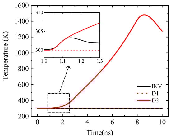 In the simulation, when the internal temperature of the diode or inverter reaches the melting point of the material, the ESD protection circuit is judged to be damaged. In this paper, the failure of the ESD protection circuit when TLP injects a negative current ESD stress pulse [27] is simulated and studied. During the current ESD stress pulse injection, D2 is prone to high-temperature combustion, while D1 and INV have no obvious temperature change. As shown in Figure 7, the discounted diagram describes the change of internal maximum temperature with time. When IS = 0.13 A, the maximum temperature inside the D2 failed to reach the melting point of the material within the pulse duration, and then with the disappearance of the pulse, the temperature of the D2 decreased to determine that there was no burning damage. When IS = 0.14 A, with the pulse injection D2, the internal temperature continues to increase, and the final D2 internal maximum temperature reaches the melting point of the material, determining the D2 burn damage. With the increase of signal amplitude Vtop, the energy absorbed by the device increases at the same time to achieve the energy required for thermal breakdown faster, resulting in the reduction of device damage time.