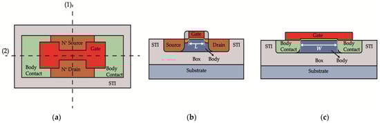 The layout and its corresponding cross-sectional view of these SOI NMOSFETs are illustrated in Figure 1. The layout of the measured devices employs an edgeless H-gate structure, hence no overlap between the gate and the shallow trench isolation (STI) is present, thereby eliminating the influence STI may have on the channel after irradiation. Additionally, each device has a body contact to eliminate the floating-body effect.