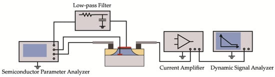To minimize experimental error and increase the reliability of the results, we tested three devices of each size in the following experiments. All devices were irradiated to 1 Mrad (Si) of γ-rays from a 60Co source at a dose rate of 100 rad (Si)/s and a temperature of ~298 K. During irradiation, all devices were biased in an ON-state, with the gate held at VDD and the other terminals grounded. The electrical and noise performance measurements were conducted within two hours after each exposure step. The electrical characterization was measured using the Keithley 4200-SCS Semiconductor Parameter Analyzer at room temperature. The threshold voltage (Vth) was obtained via linear extrapolation (LE) [], whereby the Vg axis intercept of the linear extrapolation of the Id-Vgs curve at the point with the largest first derivative was calculated when the device was in the linear region (Vds = 100 mV), such that Vth equaled the intercept minus Vds/2. Moreover, the threshold-voltage shift (∆Vth) of the device after irradiation was partitioned into the components due to trapped charge in oxide traps (∆Vot) and interface traps (∆Vit), per the midgap charge method presented by McWhorter []. Additionally, the drain-current noise power density spectral Sid of the devices was measured with a noise measurement system at room temperature. The drain-current noise signal was amplified by the low-noise current amplifier SR570 and then measured by the HP35670 dynamic signal analyzer. Figure 2 illustrates the schematic diagram of the noise measurement system used in this experiment.