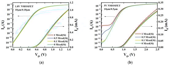 Id–Vgs curves in the linear region (Vds = 0.1 V) of (a) 1.8 V NMOSFETs for geometry: W/L = 10 μm/0.18 μm and (b) 5 V NMOSFETs for geometry: W/L = 10 μm/0.5 μm. All devices were irradiated up to 1 Mrad(Si) under the “on” bias condition.