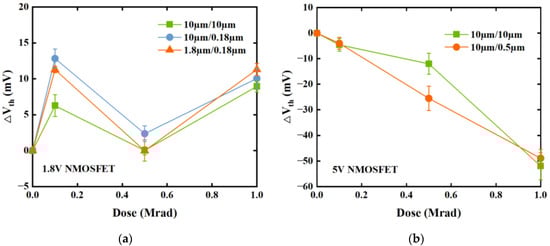 Threshold-voltage shift ∆Vth as a function of irradiation dose for (a) 1.8 V NMOSFETs with geometries W/L = 10 μm/10 μm, 10 μm/0.18 μm, and 1.8 μm/0.18 μm and (b) 5 V NMOSFETs with geometries W/L = 10 μm/10 μm and 10 μm/0.5 μm. All devices were irradiated up to 1 Mrad(Si) under the “on” bias condition.