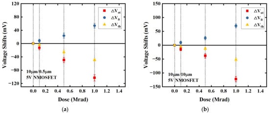 where ∆Vit is the threshold-voltage shift due to net interface-trap charge and ∆Vot is the threshold-voltage shift due to net oxide-trap charge. We split the threshold-voltage shift into ∆Vit and ∆Vot using the midgap charge method []. However, the midgap voltage of the 1.8 V device is barely detectable due to the trivial variation between the subthreshold-current curves of different irradiation doses. Figure 5 depicts the threshold-voltage shifts caused by net oxide-trap and interface-trap charge as a function of irradiation dose for 5 V NMOSFETs with geometries of (a) W/L = 10 μm/0.5 μm and (b) 10 μm/10 μm.