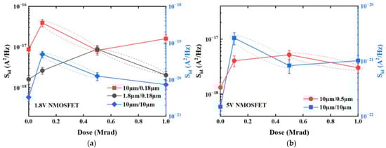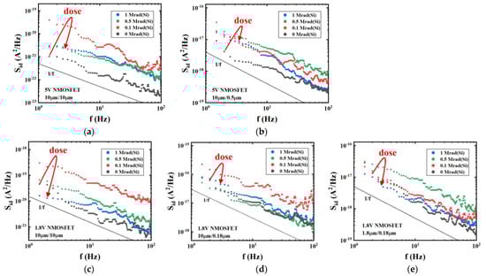 Figure 6 shows the drain-current noise power density spectrum of 1.8 V and 5 V NMOSFETs with different dimensions before and after irradiation with different doses. We measured the low-frequency noise between 1 Hz and 100 Hz in the linear region of device response where drain voltage Vds = 0.1 V and gate voltage Vgt = Vgs − Vth = 0.3 V. The low-frequency noise of all measured devices is characterized by 1/f noise. By comparing the pre-irradiation drain-current low-frequency noise magnitudes of the devices in Figure 6a,b, and those in Figure 6c,d, it can be seen that the device with the shorter gate length exhibits a higher low-frequency noise at the same gate width. Similarly, comparison of the pre-irradiation drain-current low-frequency noise magnitudes of the devices in Figure 6d,e reveals that the device with the wider gate width exhibits a higher low-frequency noise at the same gate length. These correlations observed between the device dimensions and the low-frequency noise are consistent with the previous physical explanation that low-frequency noise in MOSFETs originates from the exchange of carriers between the channel and border traps [,,]. The trend of low-frequency noise as a function of the irradiation dose is largely similar for all measured devices in Figure 6. The noise magnitudes of all devices reach a peak at a comparatively low irradiation dose, which is 0.5 Mrad for the 5 V device with geometry W/L = 10 μm /0.5 μm and 1.8 V device with geometry W/L = 1.8 μm /0.18 μm, and 0.1 Mrad for the other devices. Furthermore, the noise magnitudes at higher irradiation doses are generally lower than those at lower doses, even though the density of border traps in the oxide tends to increase at higher radiation doses. Interestingly, this trend appears to contradict the previously proposed physical mechanism of low-frequency noise that carriers exchange between the channel and border traps [,,].