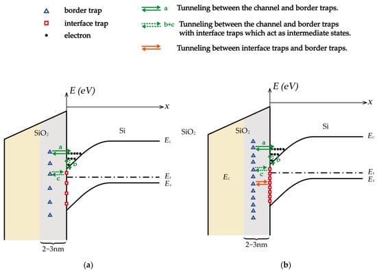 The physical processes of the origin of low-frequency noise in NMOSFETs under (a) pre-irradiation/lower-dose irradiation and (b) higher-dose irradiation in the energy band diagram.