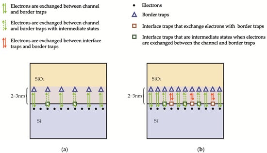 Figure 9 illustrates the schematic of low-frequency noise generation in nMOSFETs. Figure 9a displays the situation where interface traps have not yet inhibited the exchange of electrons between the channel and border traps, with the border-trap density alone resulting in the generation of low-frequency noise before/under lower-dose irradiation. Figure 9b depicts the situation under higher-dose irradiation, where interface traps have already hindered electron exchange between the channel and border traps, such that the density of border traps which actually contribute to generation of low-frequency noise is equal to the total density of border traps minus the part which undergoes electron exchange with interface traps, as shown in Equation (6):