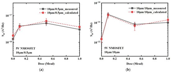 Noise magnitudes at f = 10 Hz of 5 V NMOSFETs for geometries: (a) W/L = 10 μm/0.5 μm and (b) 10 μm/10 μm as a function of irradiation dose which are measured and calculated under the modified physical mechanism.