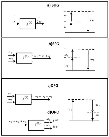 Due to the material dispersion of nonlinear media that impacts seriously the phase-matching condition, the second-order nonlinear optical processes, usually, exhibit limited spectral bandwidths. For bulk samples, the phase matching is typically obtained exploiting birefringence in anisotropic nonlinear crystals or with periodically poled nonlinear crystals (e.g., lithium niobate). In such nonlinear crystals, there is a stringent compromise between phase-matching bandwidth and total conversion efficiency, which are inversely and directly proportional, respectively, to the material’s thickness. In addition, the limited availability of high-quality non-centrosymmetric crystalline materials in integrated photonic platforms makes second-order nonlinearities less common as compared with third-order ones [,]. In Figure 1, the geometry of interactions and the energy level diagrams of the considered second-order nonlinear phenomena are reported.