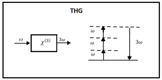 THG can be considered as the third-order equivalent of SHG. According to the photon description, in this process, three photons of frequency are destroyed, and one photon of frequency is created. The main application of THG is the realization of ultraviolet (UV) sources, where there are few choices for lasers. However, the practical use of THG requires a material having a large , a transparency window including both and , and the possibility of achieving phase matching, too. In Figure 2, the geometry of the interaction and the energy level diagram of THG are reported.