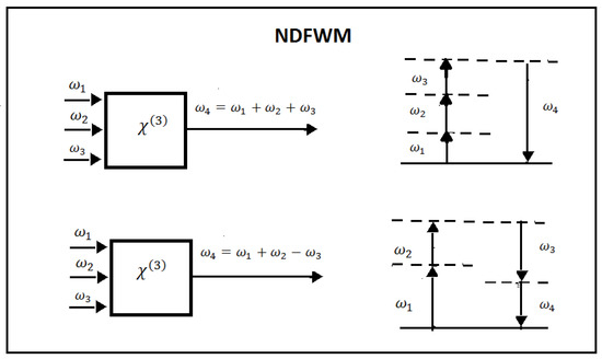 In the general case, the applied field consists of three different frequency components, and the third-order nonlinear polarization contains a number of contributions with different frequencies. Among them are , , , and . These represent four possible mixing processes, called non-degenerate four-wave mixing (NDFWM). In basic terms, NDFWM is the mixing of three different frequencies , which interact simultaneously with the medium, to produce a fourth wavelength such that the respective frequencies obey one of the previous four equalities. In Figure 3, we represent two of the four possible mixing processes. In Figure 3, interactions and energy level diagrams of two of the possible mixing process are reported.