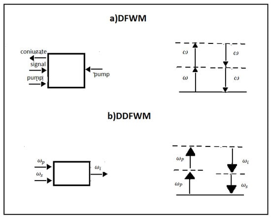 Note that for the special case of the dual degenerate FWM (DDFWM) when , two frequencies, related to a pump () and a weaker signal (), can produce a third one, which is known as the idler frequency, such that holds. In other words, in the DDFWM, two equal pump photons () are annihilated to create two output photons called the signal () and idler (). In Figure 4, interactions and energy level diagrams for the degenerate and dual degenerate FWM are reported.