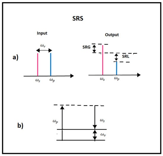 An SRS phenomenon occurs in the presence of a high-energy transfer from a high-power pump beam to a probe beam (copropagating or counterpropagating) [,]. In particular, this energy exchange occurs when the frequency difference between the pump and the Stokes laser beams matches a given molecular vibrational frequency of the sample under test. The SRS effect occurs in the form of a gain of the Stokes beam power (stimulated Raman gain (SRG)) and a loss of the pump beam power (stimulated Raman loss (SRL)). SRS depends on the pump intensity and on a gain coefficient. The latter is proportional to the spontaneous Raman scattering cross section and inversely proportional to the linewidth of the corresponding Raman line. Because of its coherent nature, the molecular bonds oscillate in phase and interfere constructively inside the focus area of the laser beam. As a consequence, an SRS signal, which is orders of magnitude bigger than spontaneous Raman scattering, is generated (about 20–30% of the incident laser radiation can efficiently be converted into SRS). Due to its Raman-shifted output, SRS is a workable method for generating coherent radiation at new frequencies. SRS permits, in principle, the amplification in a wide interval of wavelengths, from the ultraviolet to the infrared. Since the Raman frequency of a medium is usually fixed, a tunable pump laser is required to achieve Raman source tunability [,]. In Figure 5, the SRG and SRL modalities and level diagrams for SRS phenomena are reported.