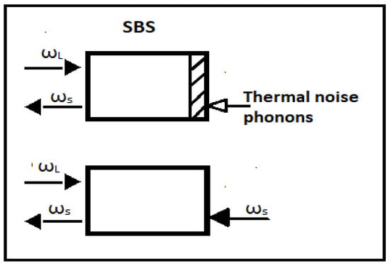 Brillouin scattering describes the scattering of an optical wave from an acoustic wave, which can be a longitudinal pressure/density wave in a solid, gas, or liquid; an acoustic surface wave; or a transverse acoustic wave. When an optical wave is scattered from the acoustic wave, a frequency-shifted optical wave is generated, called the Stokes wave, when lower in frequency than the pump wave, and the anti-Stokes wave, when at a higher frequency. This process can be stimulated, which leads to an exponential gain of the optical Stokes wave. A small optical seed that counterpropagates the optical pump creates an optical beat pattern. The small seed can be a laser coupled from the opposite side into the medium than the pump or originate from the scattering of the pump from thermal phonons; see Figure 6. When the frequency separation of the pump and the seed matches the Brillouin frequency shift (BFS) in the medium, then the optical beat pattern reinforces the acoustic wave via electrostriction, which, in return, amplifies the seed/Stokes wave via scattering of the optical pump from the moving acoustic wave. This feedback can create strong amplification of the initially weak seed/Stokes wave []. In Figure 6, level diagrams for SBS phenomena are reported.