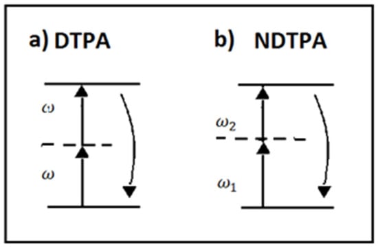 Two-photon absorption (TPA) is a third-order nonlinear optical interaction, in which two photons are simultaneously absorbed through a virtual intermediate state to produce a real excitation. We can distinguish between two types of TPA: a degenerate process, in which two photons with the same wavelength are absorbed, and a nondegenerate process, in which one photon with wavelength λp from a pump source and one photon from a signal source with wavelength λs are both absorbed. The latter can be applied to modulate a probe signal through a process called cross-absorption modulation (XAM). Nonlinear absorption and related phenomena such as two-photon absorption and saturable or reverse saturable absorption have some important applications in light generation (Q-switching and mode-locking lasers), in laser modulation, taking advantage of cross-modulation (XAM), and in nonlinear detection of light by TPA. In Figure 7, level diagrams for DTPA and NDTPA are reported.