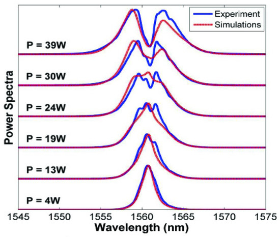 Efficient self-phase modulation, using ~1 ps pulses near 1560 nm, was achieved in low loss (<0.06 dB/cm) and 45 cm long spiral integrated waveguide of high-index silica glass []. In this figure, experimentally measured output power spectra (solid blue lines) and theory (dashed red lines) for different input (coupled) power levels are reported. Reprinted with permission from [] © The Optical Society.